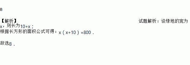 某小区在规划设计时,准备在两栋楼房之间,设置一块面积为800平方米的矩形绿地,并且长比宽多10米,设绿地的宽为x米,根据题意,可列方程为( )