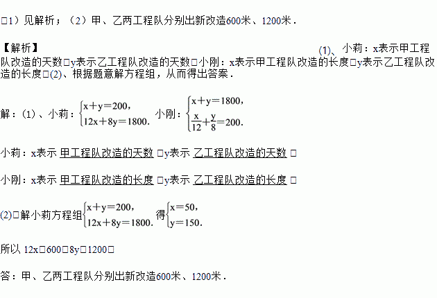 春天来了,石头城边,秦淮河畔,鸟语花香,柳条飘逸.为给市民提供更好的休闲锻炼环境,决定对一段总长为1800米的外秦淮河沿河步行道出新改造,该任务由甲、乙两工程队先后接力完成.甲工程队每天改造12米,乙工程队每天改造8米,共用时200天.