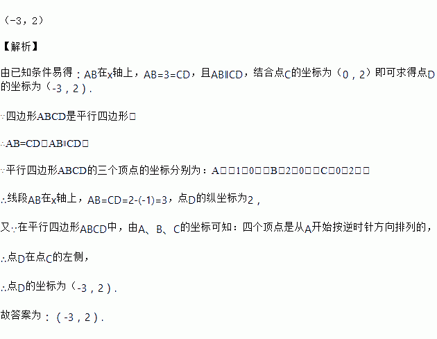 已知平行四边形ABCD的三个顶点坐标分别为A(﹣1,0)、B(2,0)、C(0,2),则第四个顶点D的坐标为____.