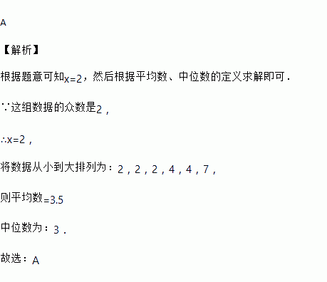 一组数据2,4,x,2,4,7的众数是2,则这组数据的平均数,中位数分别为( )