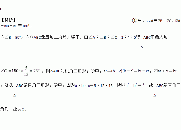 △ABC的三边长分别为a,b,c,下列条件:①∠A=∠B-∠C;②∠A:∠B:∠C=3:4:5;③a2=(b+c)(b-c);④a:b:c=5:12:13,其中能判断△ABC是直角三角形的个数有( )