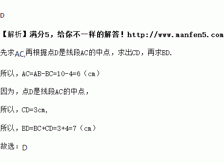 如图,点C、D是线段AB上的两点,点D是线段AC的中点.若AB=10cm,BC=4cm,则线段DB的长等于( )