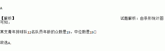 A 【解析】试题解析:由条形统计图可知, 某支青年排球队12名队员年龄的众数是19,中位数是19, 故选A.