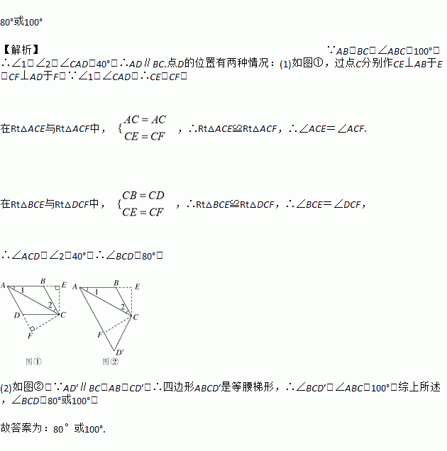 以线段AC为对角线的四边形ABCD(它的四个顶点A,B,C,D按顺时针方向排列),已知AB=BC=CD,∠ABC=100°,∠CAD=40°,则∠BCD的度数为________.