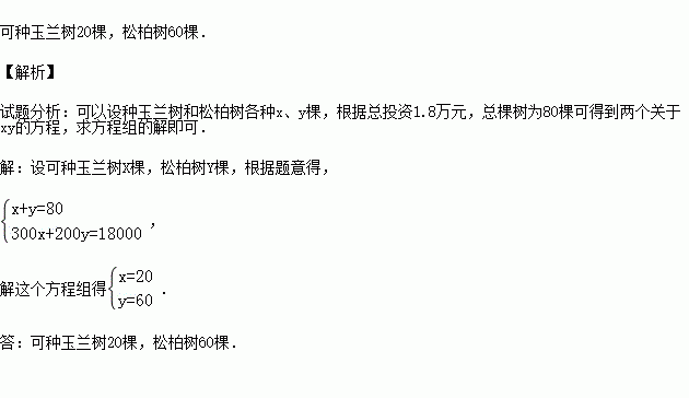 (2015春•灌云县校级期末)为了净化空气,美化环境,我县城兴华小区计划投资1.8万元种玉兰树和松柏树共80棵,已知某苗圃负责种活以上两种树苗的价格分别为:300元/棵,200元/棵,问可种玉兰树和松柏树各多少棵?