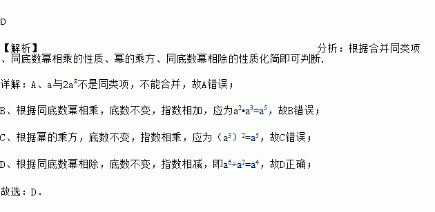 A. a+2a2=3a3 B. a2•a3=a6 C. (a3)2=a5 D. a6÷a2=a4