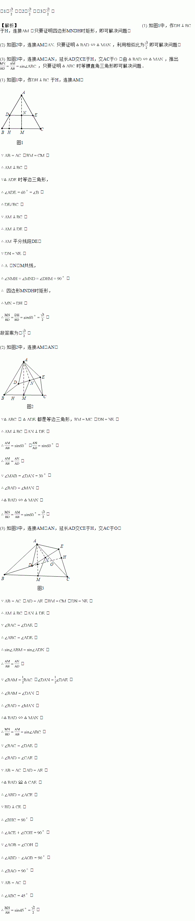 如图1,过等边三角形ABC边AB上一点D作交边AC于点E,分别取BC,DE的中点M,N,连接MN.![]()