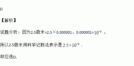 D 【解析】 试题分析:因为2.5微米=2.5×0.000001,0.000001=, 所以2.5微米用科学记数法表示是. 故应选D.