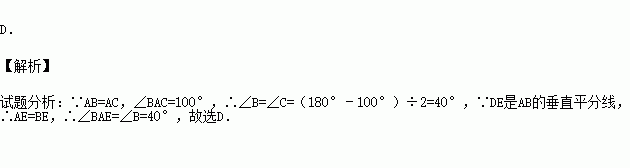 如图,在△ABC中,AB=AC,∠BAC=100°,AB的垂直平分线DE分别交AB、BC于点D、E,则∠BAE=( )