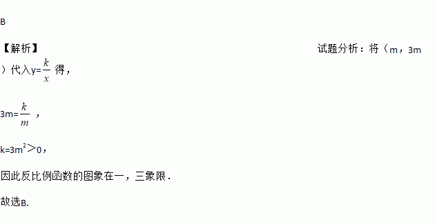 B 【解析】试题分析:将(m,3m)代入y=得, 3m=, k=3m2>0, 因此反比例函数的图象在一,三象限. 故选B.