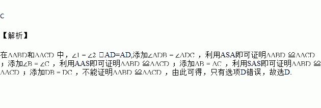 如图,已知∠1=∠2,欲证△ABD≌△ACD,还需从下列条件中补选一个,则错误的是( )