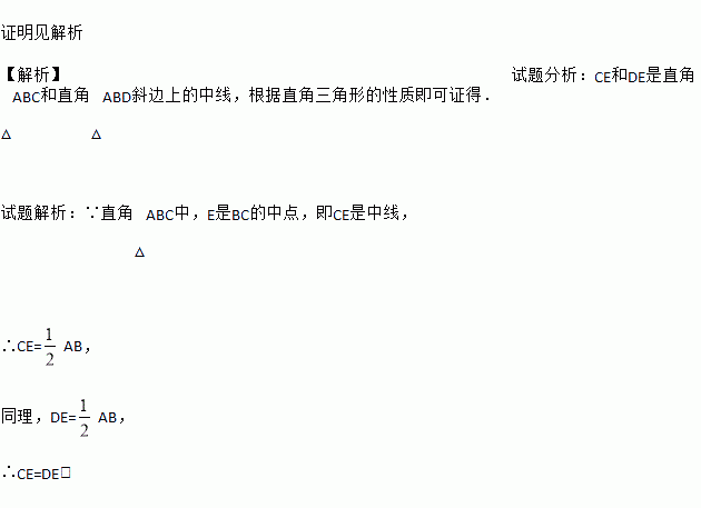 如图,△ABC和△ABD中,∠C=∠D=Rt∠,E是BC边上的中线.请你说明CE=DE的理由.