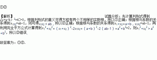 已知关于x的方程x2-(a+b)x+ab-1=0,x1,x2是此方程的两个实数根,现给出三个结论:①x1≠x2 ②x1x2<ab③x12+x12<a2+b2,则正确结论的序号是______________.