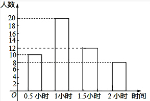 分析:(1)用0.5小时的人数除以对应的百分比求出总人数,再用总人数乘以1.5小时所占的百分比,即可补全统计图.