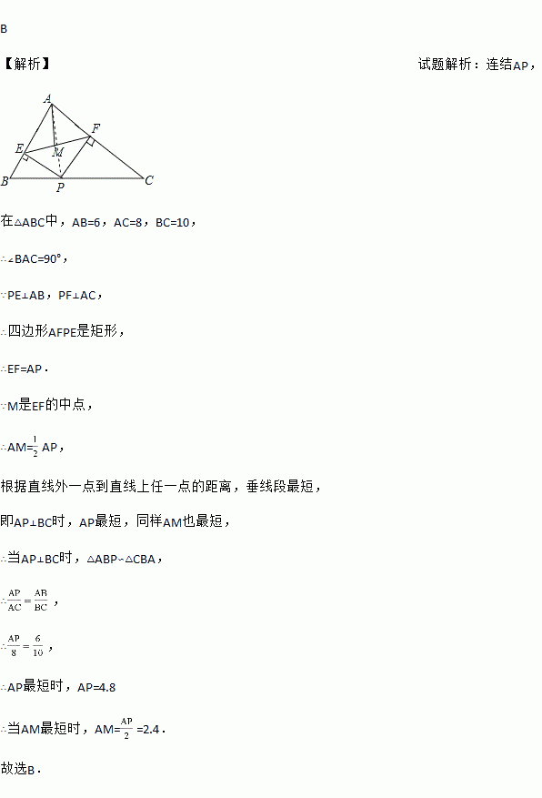 如图,在△ABC中,AB=6,AC=8,BC=10,P为边BC上一动点,PE⊥AB于E,PF⊥AC于F,M为EF中点,则AM的最小值为( )