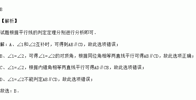 下列图形中,由∠1=∠2≠90°,能得到AB∥CD的是( )