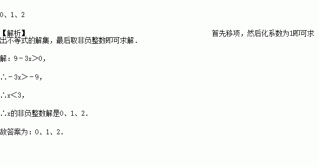 不等式9﹣3x>0的非负整数解是_____.