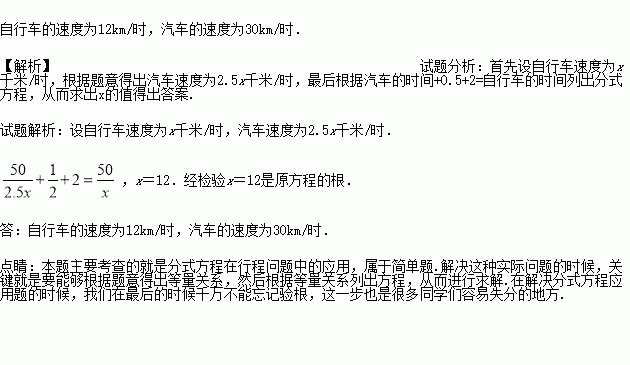甲、乙两地相距50km,A骑自行车,B乘汽车,同时从甲城出发去乙城.已知汽车的速度是自行车速度的2.5倍,B中途休息了0.5小时还比A早到2小时,求自行车和汽车的速度.