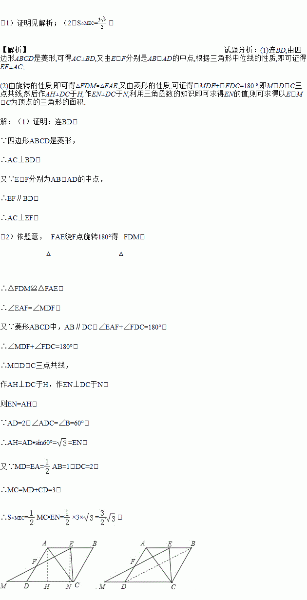 已知,如图,四边形ABCD是边长为2的菱形,E、F分别是AB、AD的中点,连EF,将△FAE绕点F旋转180°得△FDM.