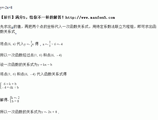 已知某一次函数的图像经过点(1,6),且与正比例函数y=-x的图像交于点(6,a),求此一次函数的关系式。