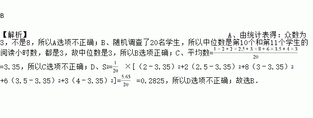 则关于这20名学生阅读小时数的说法正确的是( )