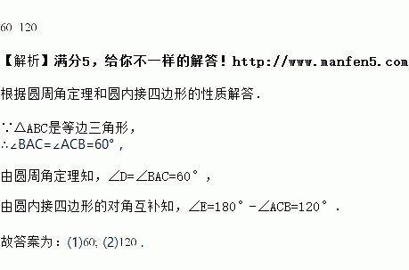 如图,是等边三角形的外接圆,、是上两点,则________度,________度.