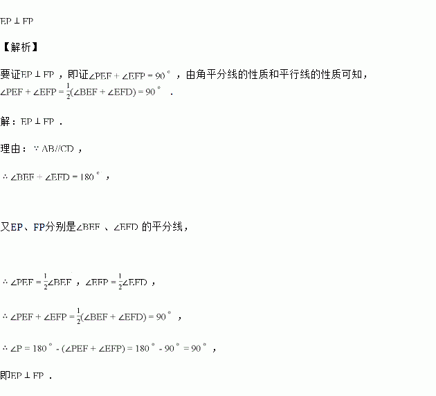 如图,已知,EF与AB、CD分别相交于点E、F,与的平分线相交于点P,问:吗?请说明理由.
