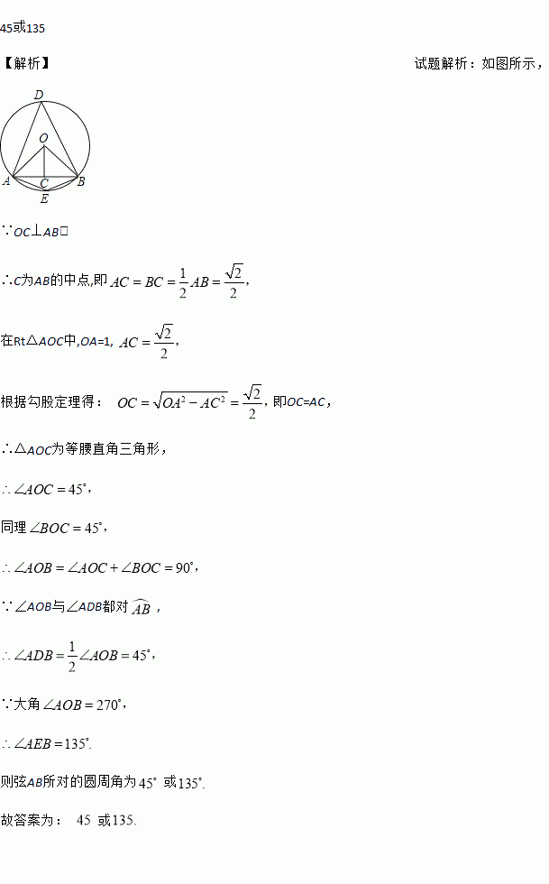 已知⊙O半径为1,A、B在⊙O上,且,则AB所对的圆周角为__o.