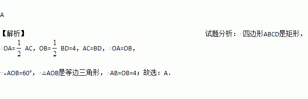如图,矩形ABCD中,对角线AC,BD交于点O.若∠AOB=60°,BD=8,则AB的长为( )