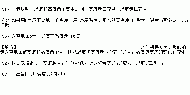 (1)上表反映了温度和高度两个变量之间.高度是自变量,温度是因变量. (2)如果用h表示距离地面的高度,用t表示温度,那么随着高度h的增大,温度t逐渐减小(或降低). (3)距离地面6千米的高空温度是-16℃. 【解析】(1)根据图表,反映的是距离地面的高度和温度两个量,所以温度和高度是两个变化的量,温度随高度的变化而变化; (2)根据表格数据,高度越大,时间越低,所以随着...