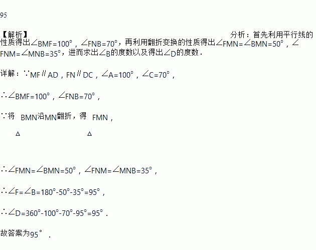 如图,四边形ABCD中,点M、N分别在AB、BC上,将沿MN翻折,得,若,,则的度数为______