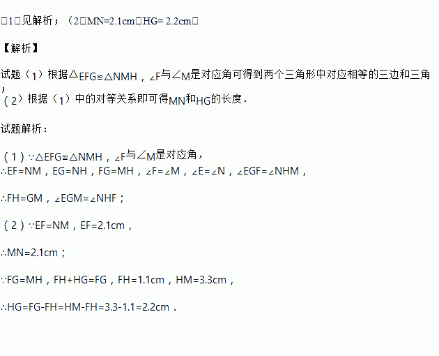 (2)若EF=2.1 cm,FH=1.1 cm,MH=3.3 cm,求MN和HG的长.