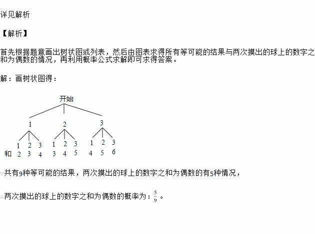 一只不透明的袋子中,装有分别标有数字1、2、3的三个球,这些除所外都相同,搅匀后从摸出个,记录下后放回袋并搅匀,再从任意摸出个,记录下,请用列表或画树状图方法,求出两次摸出上之和为偶数概率.