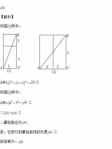 如图,一只蚂蚁从长、宽都是2,高是5的长方体纸盒的A点沿纸盒面爬到B点,那么它所行的最短路线的长是________.