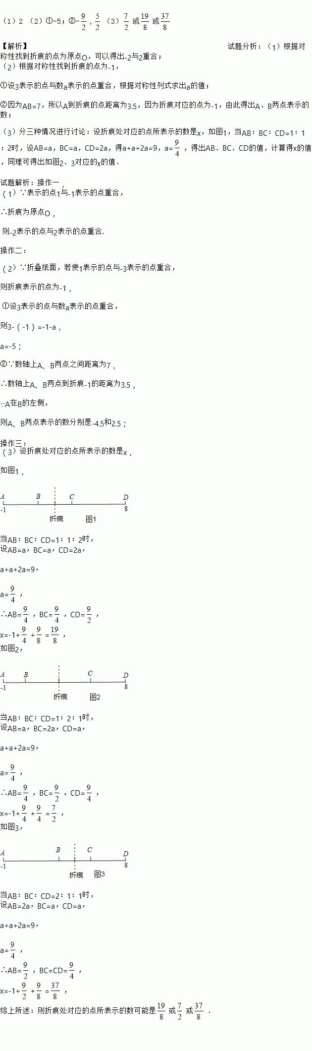 (3)在数轴上剪下9个单位长度(从﹣1到8)的一条线段,并把这条线段沿某点折叠,然后在重叠部分某处剪一刀得到三条线段(例如下图). 若这三条线段的长度之比为1:1:2,则折痕处对应的点所表示的数可能是_____________________.