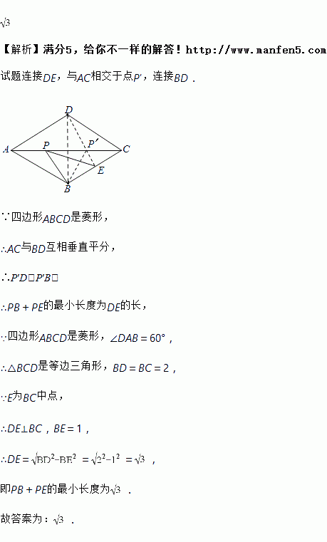 如图,菱形ABCD的边长为2,∠DAB=60°,点E为BC边的中点,点P为对角线AC上一动点,则PB+PE的最小值为__________.