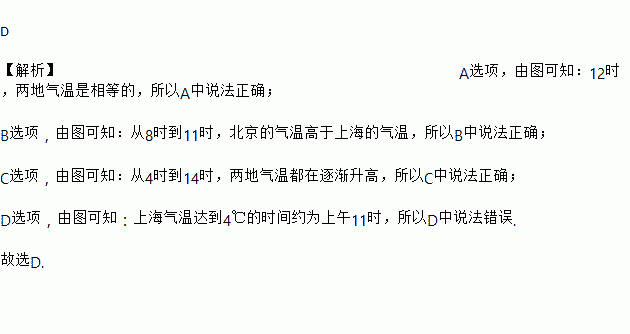 C. 从4时到14时,北京、上海两地的气温逐渐升高