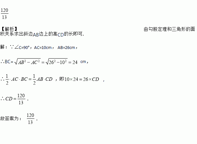 已知⊿ABC,∠C=90°,一条直角边AC=10cm,斜边AB=26cm,则斜边上的高CD=___________cm.