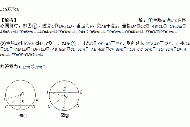 1cm或7cm 【解析】【解析】 ①当弦AB和CD在圆心同侧时,如图①,过点O作OF⊥CD,垂足为F,交AB于点E,连接OA,OC,∵AB∥CD,∴OE⊥AB,∵AB=8cm,CD=6cm,∴AE=4cm,CF=3cm,∵OA=OC=5cm,∴EO=3cm,OF=4cm,∴EF=OF﹣OE=1cm; ②当弦AB和CD在圆心异侧时,如图②,过点O作OE⊥AB于点E,反向延长OE交AD于...