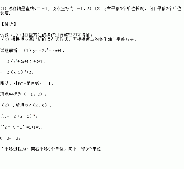 (2)将这个抛物线平移,使顶点移到点P(2,0)的位置,写出所得新抛物线的表达式和平移的过程.