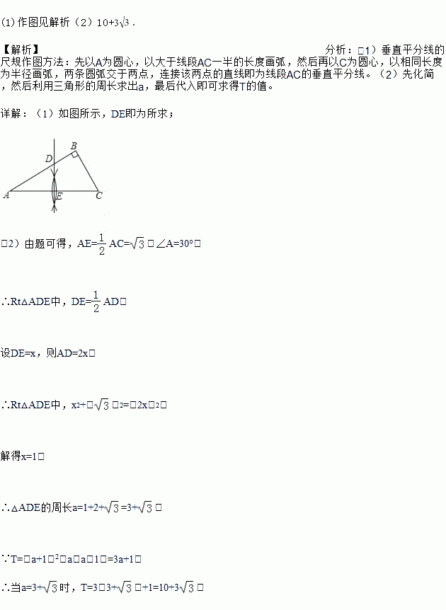 (2)若△ADE的周长为a,先化简T=(a+1)2﹣a(a﹣1),再求T的值.
