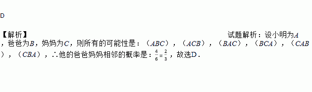 小明和他的爸爸妈妈共3人站成一排拍照,他的爸爸妈妈相邻的概率是 ( )