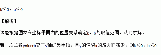 若一次函数y=kx+b交于y轴的负半轴,且y的值随x的增大而减少,则k____0,b______0.(填“>”、“<”或“=”)