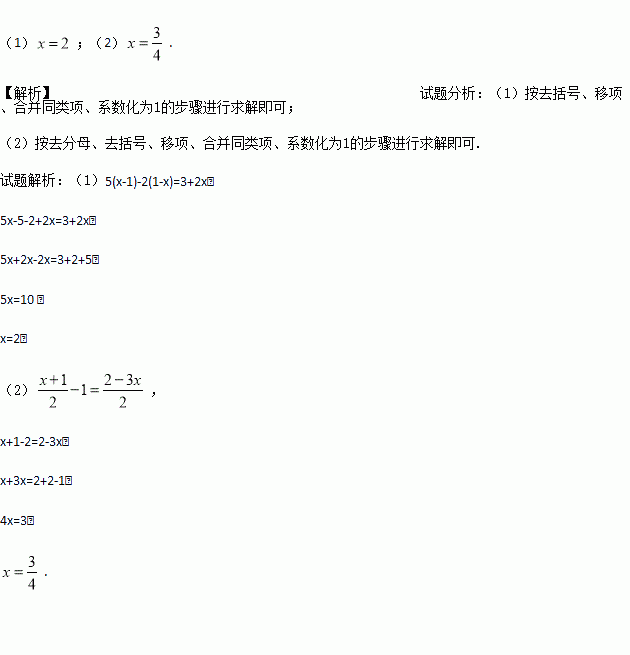 解方程:(1)5(x-1)-2(1-x)=3+2x; (2).