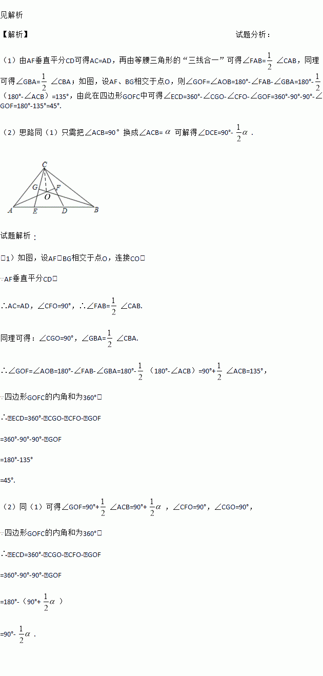如图,在△ABC中,∠ACB=90°,点D,E在AB上,且AF垂直平分CD,BG垂直平分CE.(1)求∠ECD的度数;(2)若∠ACB为α,则∠ECD的度数能否用含α的式子来表示.