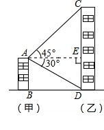 如图,甲楼AB的高度为20米,自甲楼楼顶A处,测得乙楼顶端C处的仰角为450,测得乙楼底部D处的俯角为300,则乙楼CD的高度是 米.![]()