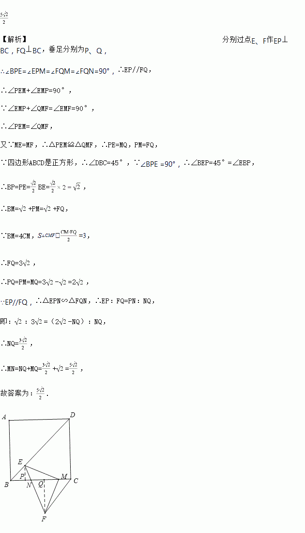 如图在正方形ABCD中,点M为BC边上一点,BM=4MC,以M为直角顶点作等腰直角三角形MEF,点E在对角线BD上,点F在正方形外EF交BC于点N,连CF,若BE=2,S△CMF=3,则MN=_____.