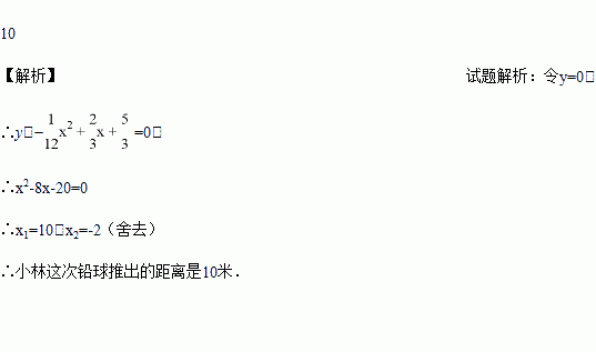校运动会铅球比赛时,小林推出的铅球行进的高度y(米)与水平距离x(米)满足关系式,则小林这次铅球推出的距离是___________米.