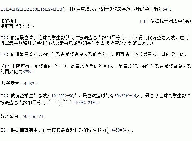 (3)该校共有450名学生,根据调查结果,估计该校最喜欢排球的学生数.