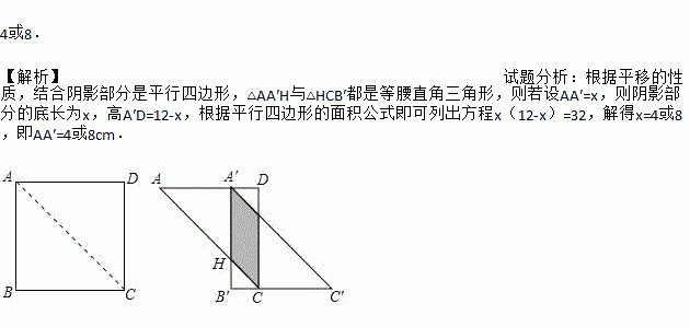 Èçͼ£¬½«±ß³¤Îª12µÄÕý·½ÐÎABCDÑØÆä¶Ô½ÇÏßAC¼ô¿ª£¬ÔÙ°Ñ¡÷ABCÑØ×ÅAD·½ÏòÆ½ÒÆ£¬µÃµ½¡÷A¡äB¡äC¡ä£¬µ±Á½¸öÈý½ÇÐÎÖØµþ²¿·ÖµÄÃæ»ýΪ32ʱ£¬ËüÒÆ¶¯µÄ¾àÀëAA¡äµÈÓÚ £®